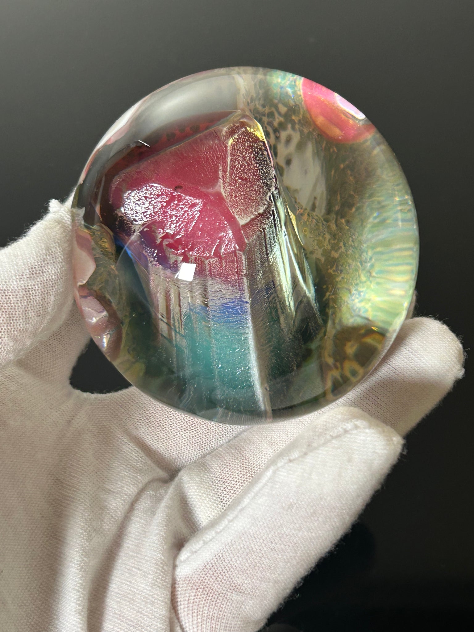 Imagine finding a piece of quartz with a tourmaline like this inside! This crystal clear glass dome acts like a magnifying lens to see the minerals inside. All glass even the tourmaline.