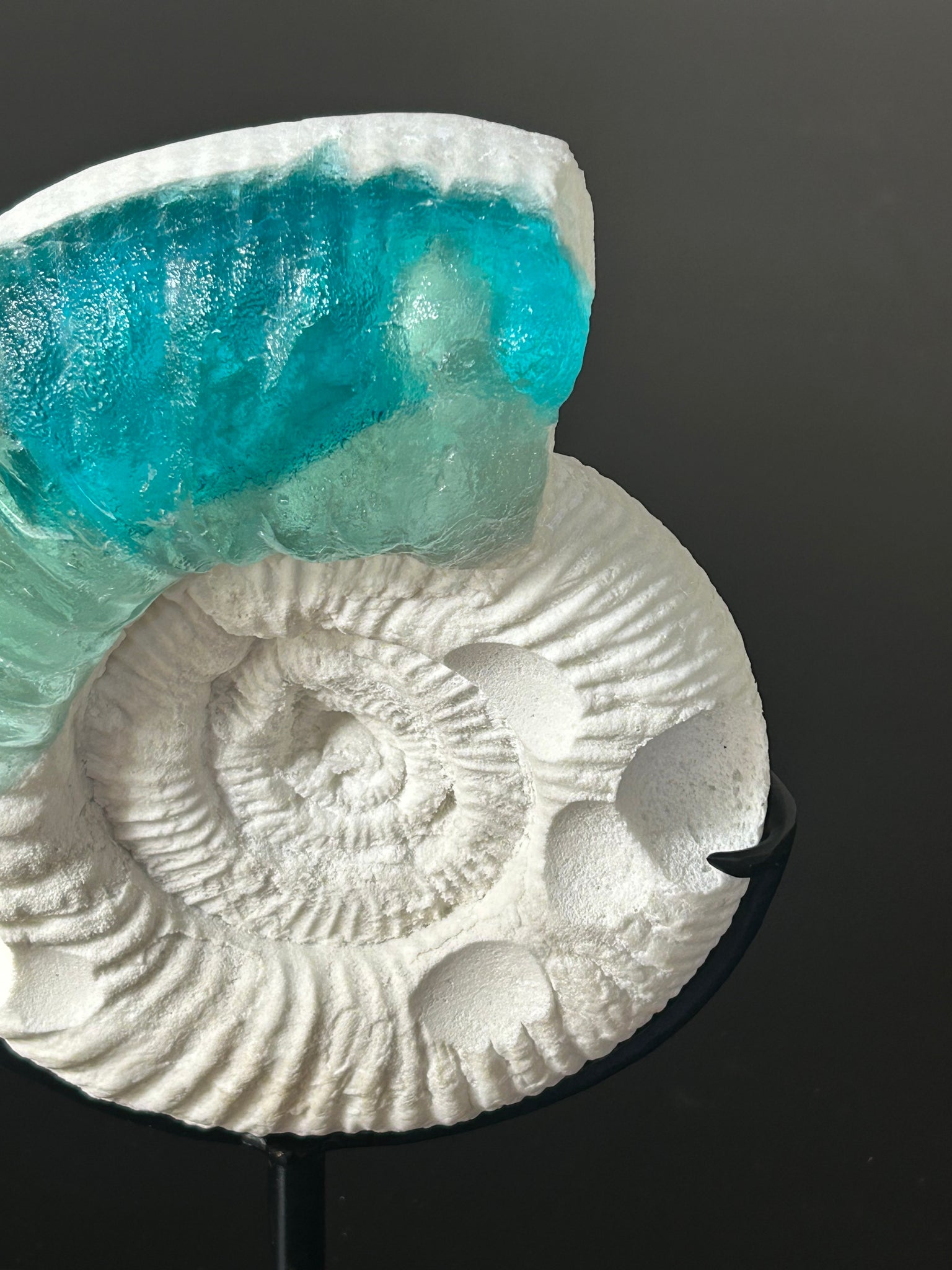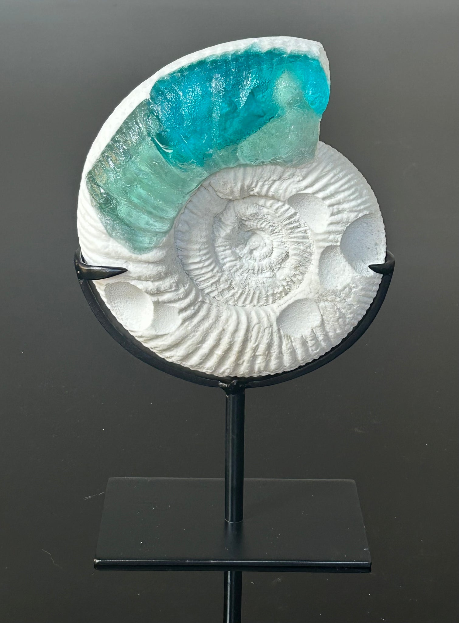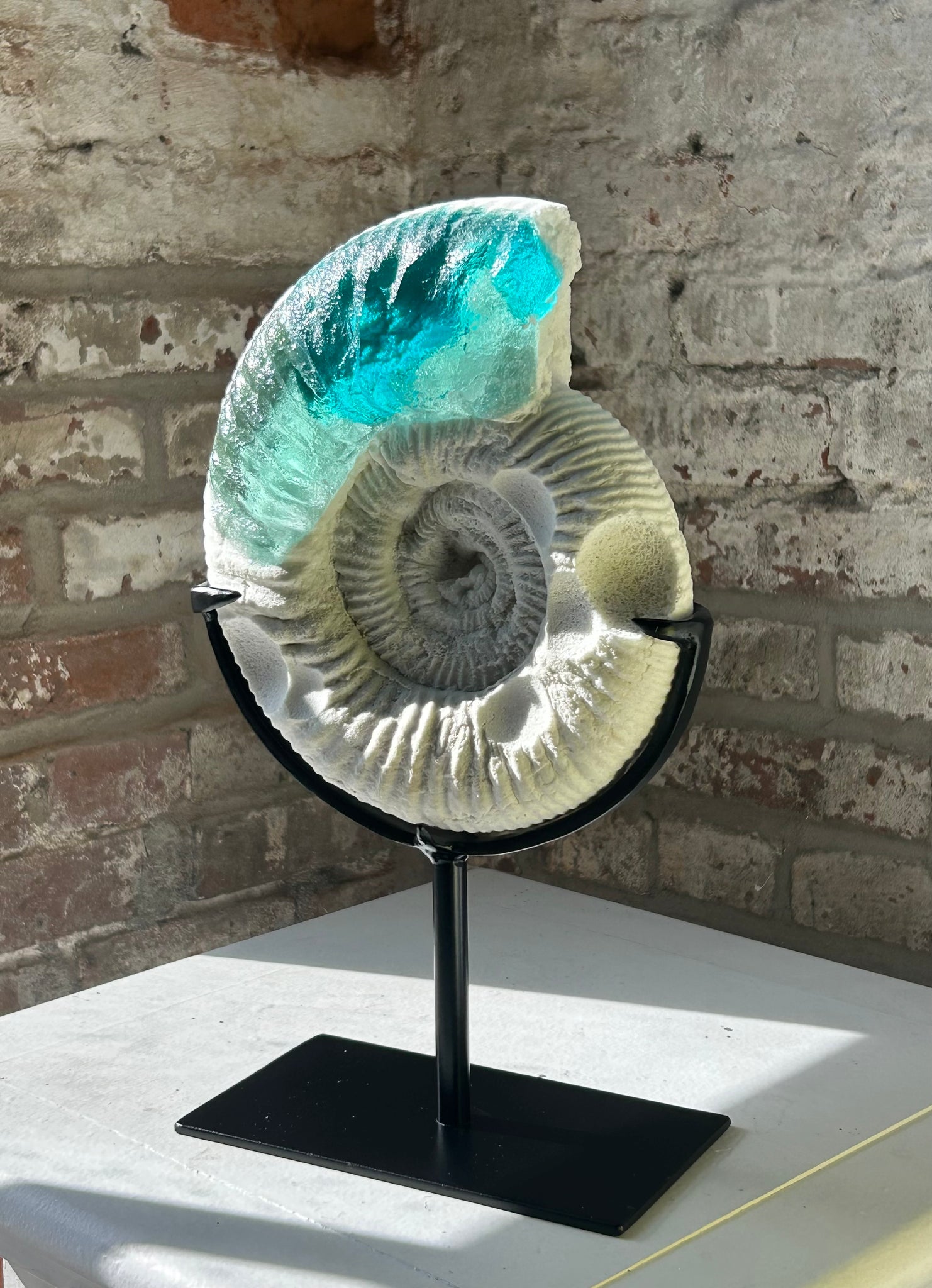 The ocean is still blue and alive in this 500 million year old fossil turned into cast glass sculpture. Preserved and preserved again with the aquatic colors of glass.