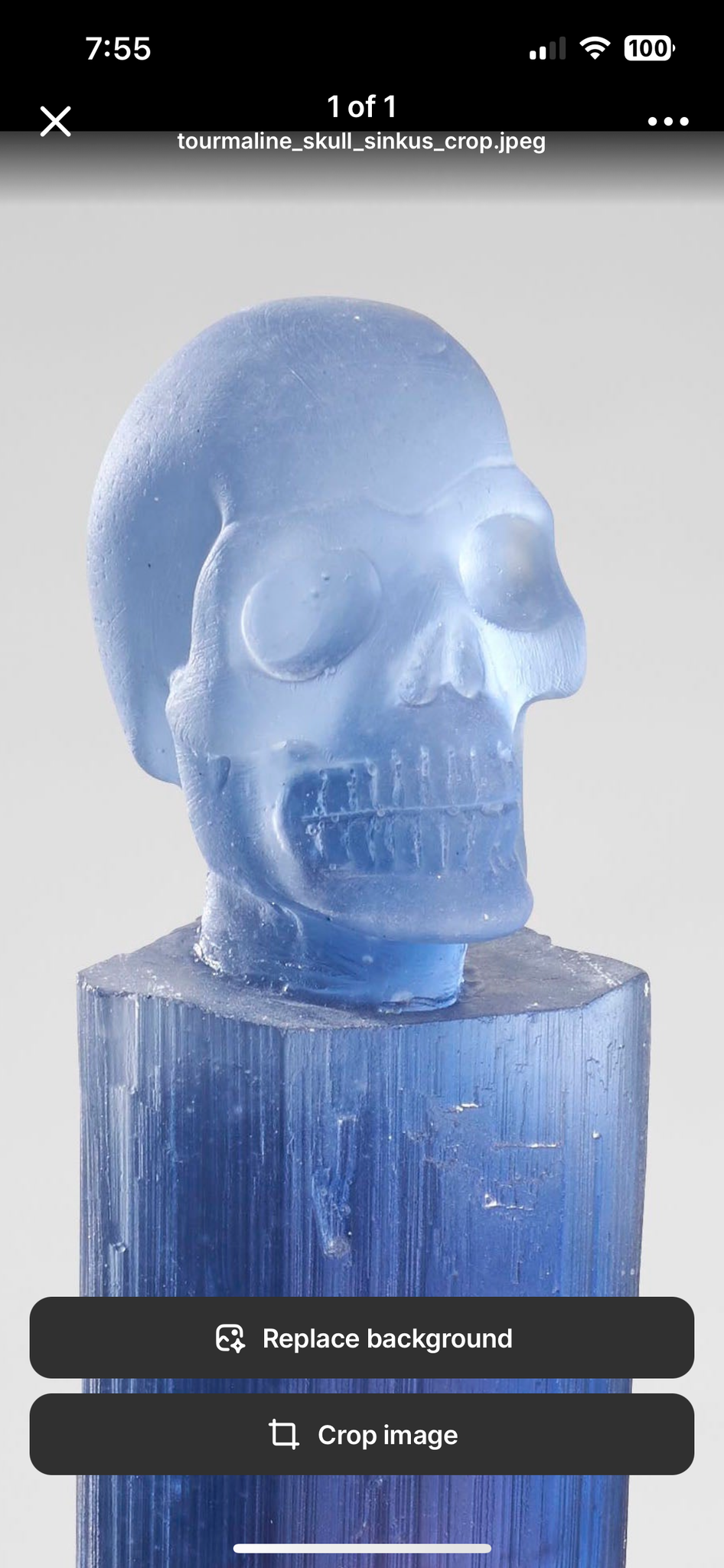 limited edition: cast glass sculpture of a skull carved at the termination of an exceptionally larger tourmaline crystal.