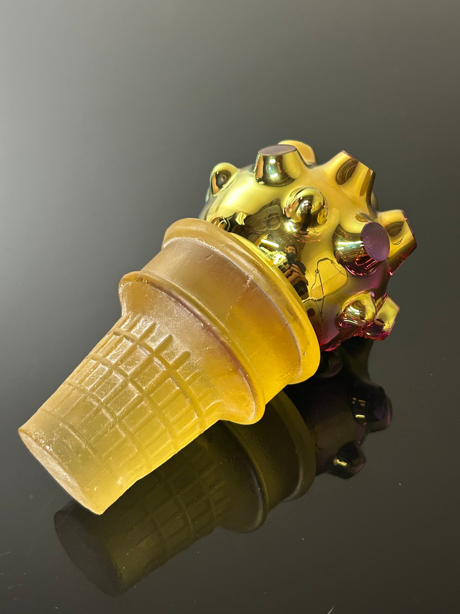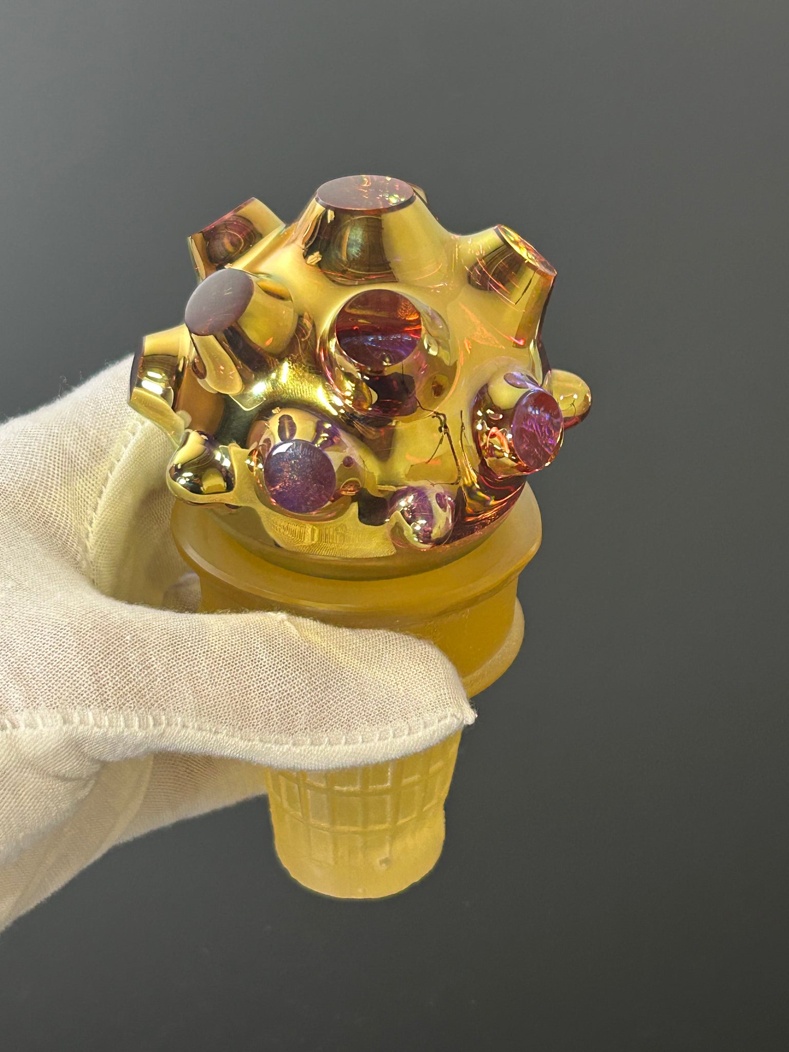 Ice cream is a joy. A treat. Not a necessity. Art and gold are also a treat. The Golden dichroic nodule is like an indulgence of light, color and luxury.