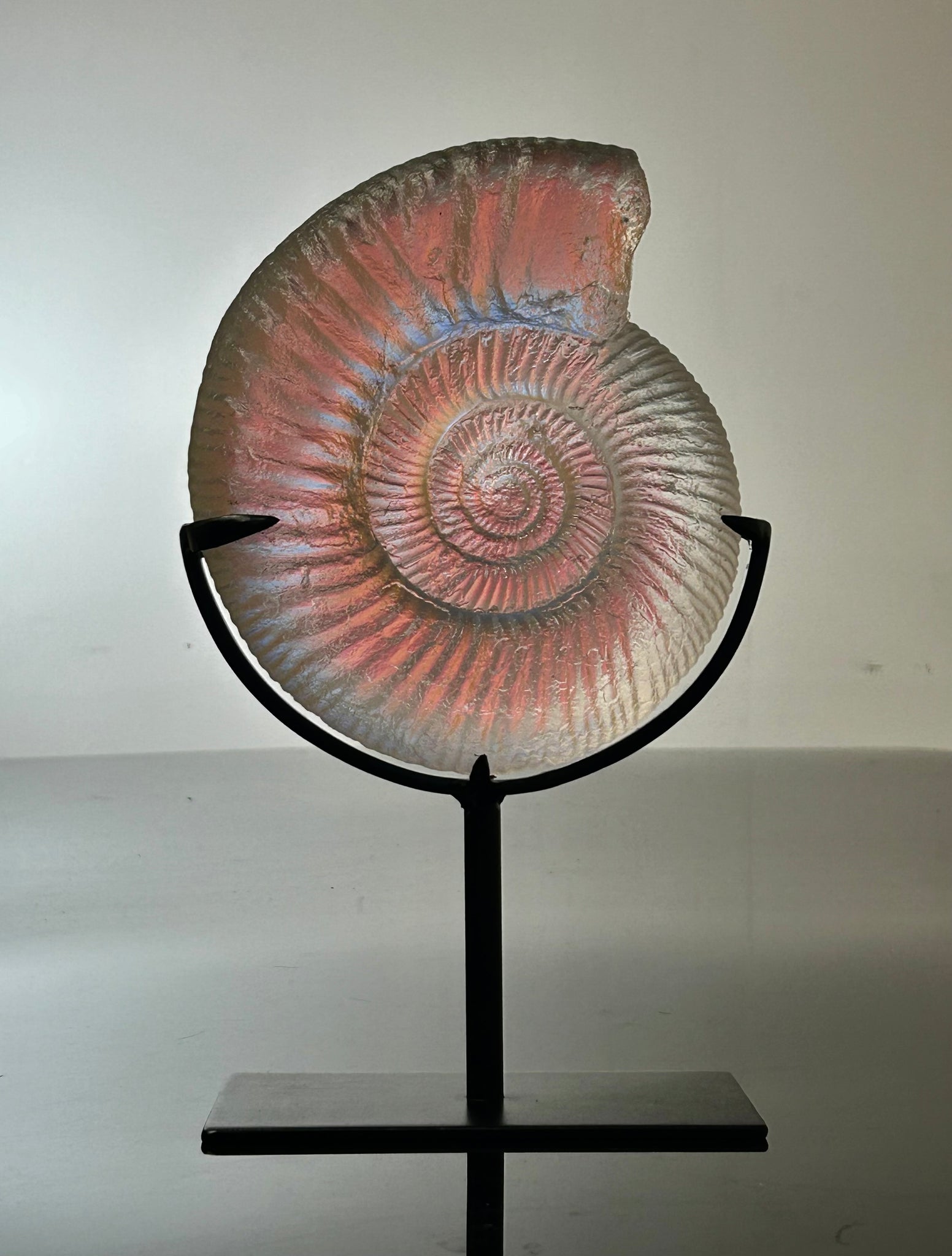 lluminating with Aural dichroic glass this cast glass ammonite was sculpted of solid glass and dichroic glass. This Ammonite sculpture changes colors depending on the location of the light. When the sun lights it from behind it is pink, yellow and purples, when lit from the front blues and greens.