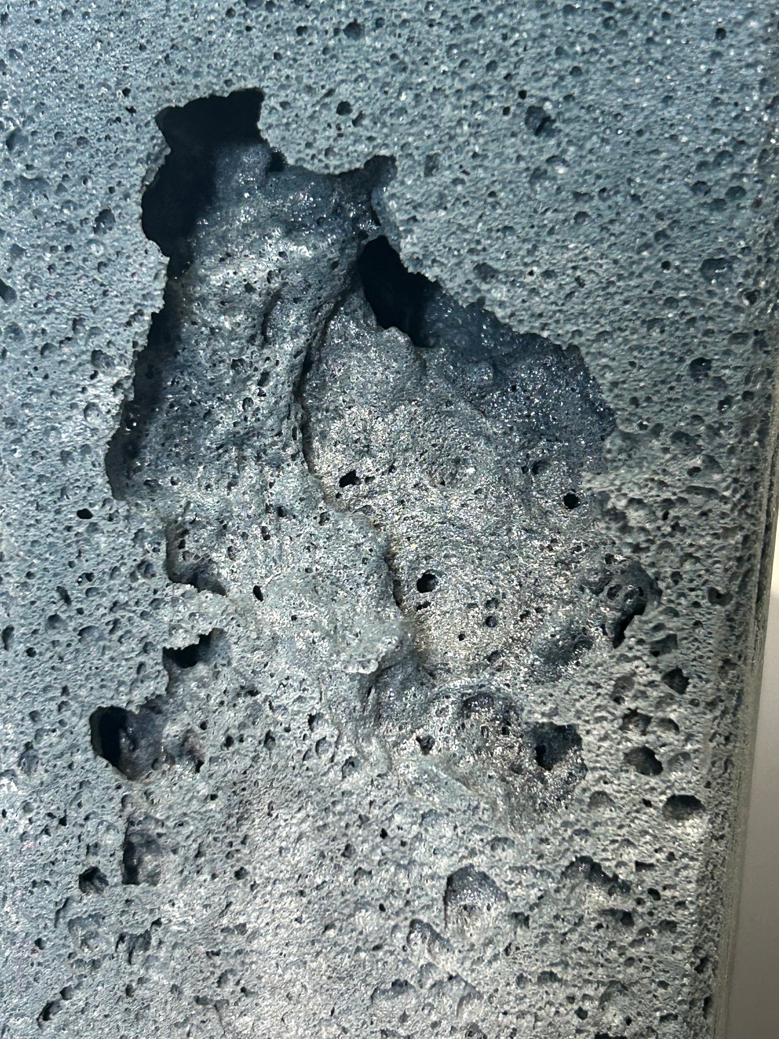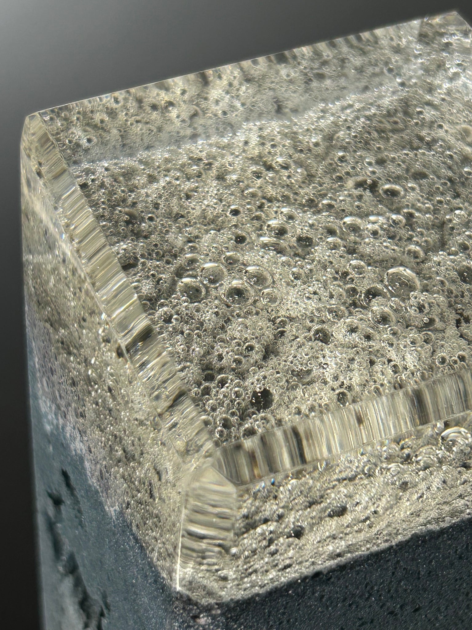 cast vesicular glass with crystal clear glass , carved and polished in the hydroelectric powered studio of Jeremy Sinkus in Shelburne Falls Massachusetts